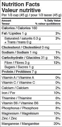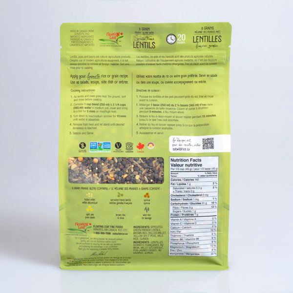 Ingredients: sprouted French lentils, quinoa, wild rice, brown rice, split peas and hulled mullet